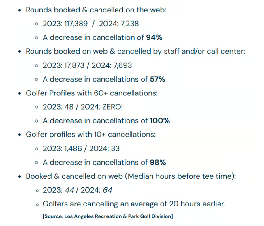 Speculative booking collapses. LA's numbers are hard to argue with - serial cancellers (60+ cancellations) went from 398 accounts to 13. That's not incremental improvement; it's a near-total elimination of the behavior. For any course dealing with no-shows or phantom bookings, a non-refundable deposit creates immediate accountability.