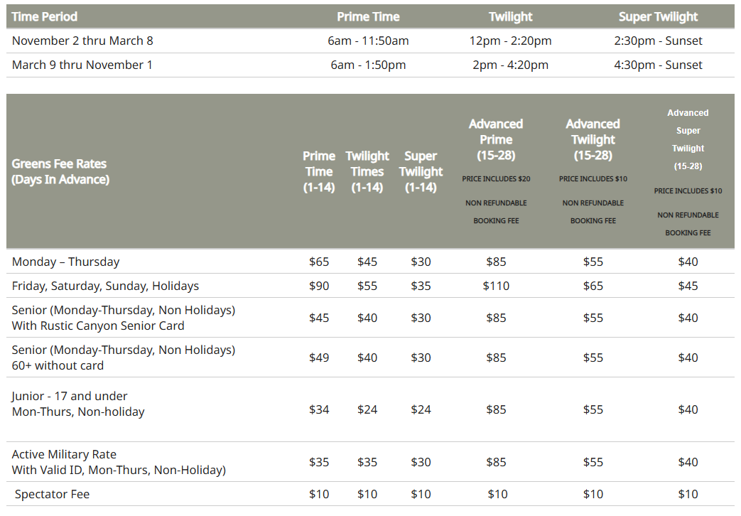Rustic Canyon splits its booking into two windows. Within 1–14 days, golfers book at standard rates—$65 for prime time Monday through Thursday, $90 on weekends.